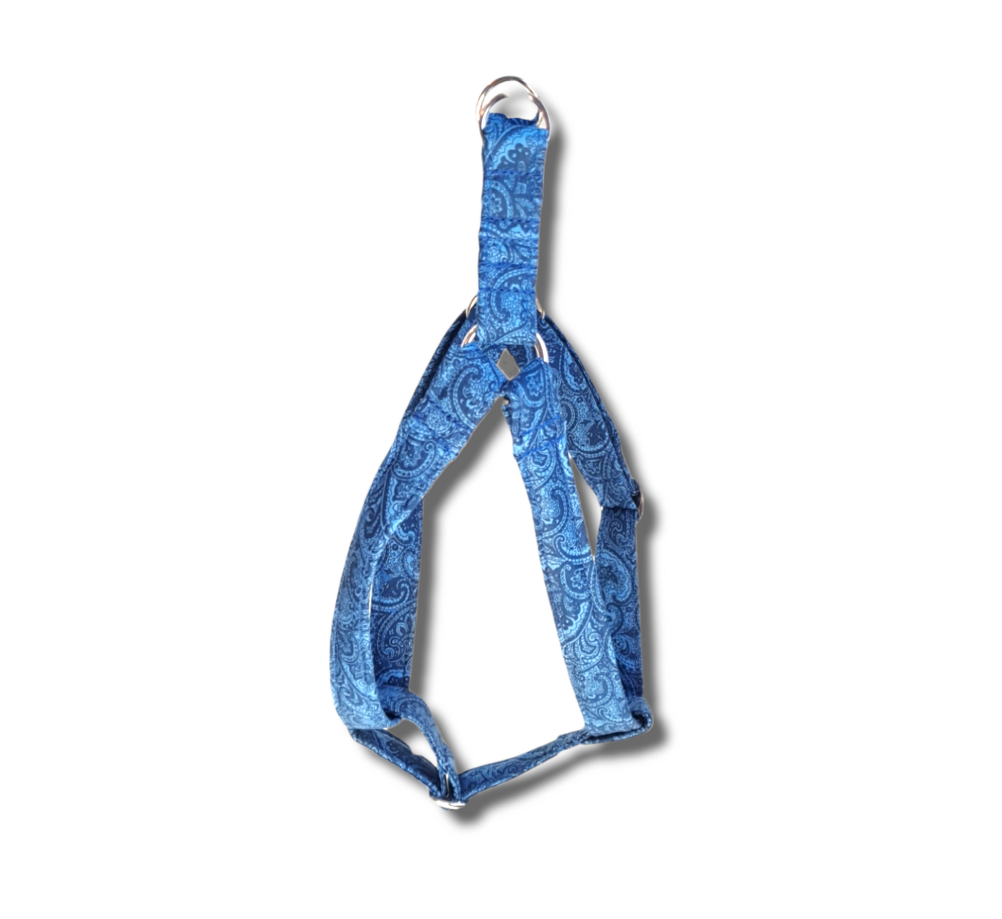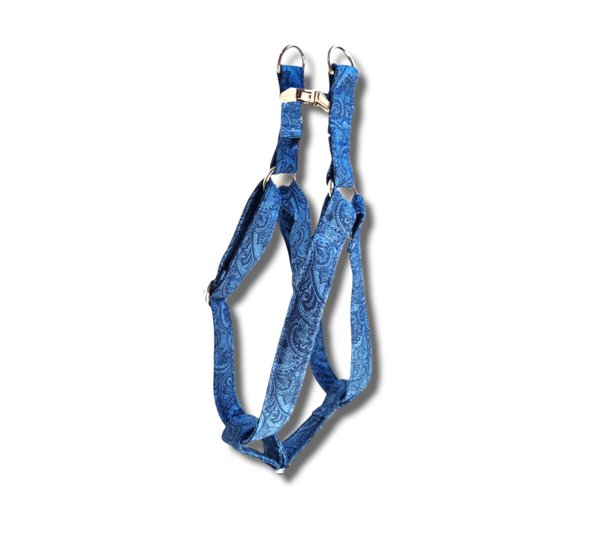 Our harnesses are made with a durable polypropylene webbing covered in this blue paisley print cotton design and the assembled with our strong metal hardware to give your harness a luxurious finish.