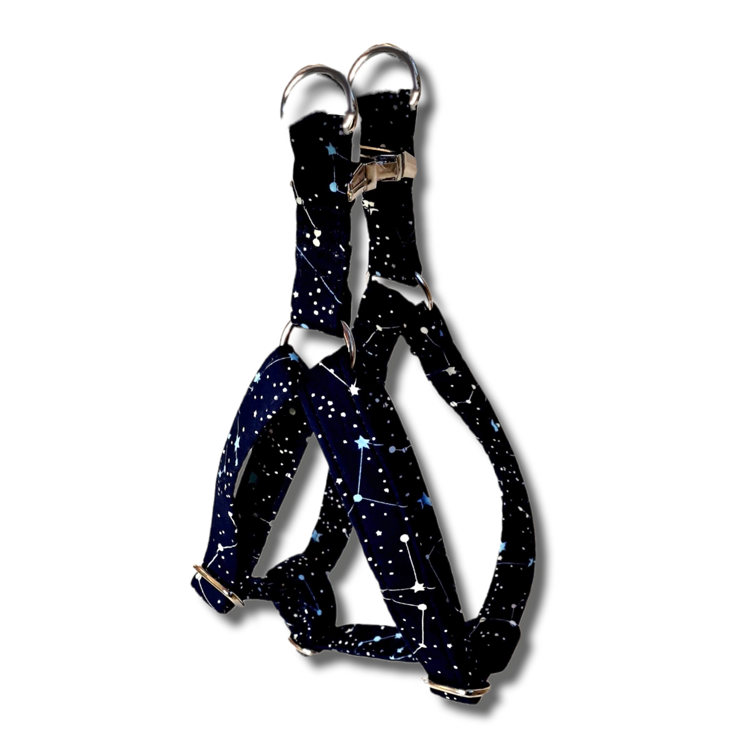 Our harnesses are made with a durable polypropylene webbing covered in this constellation print cotton design and the assembled with our strong metal hardware to give your harness a luxurious finish.