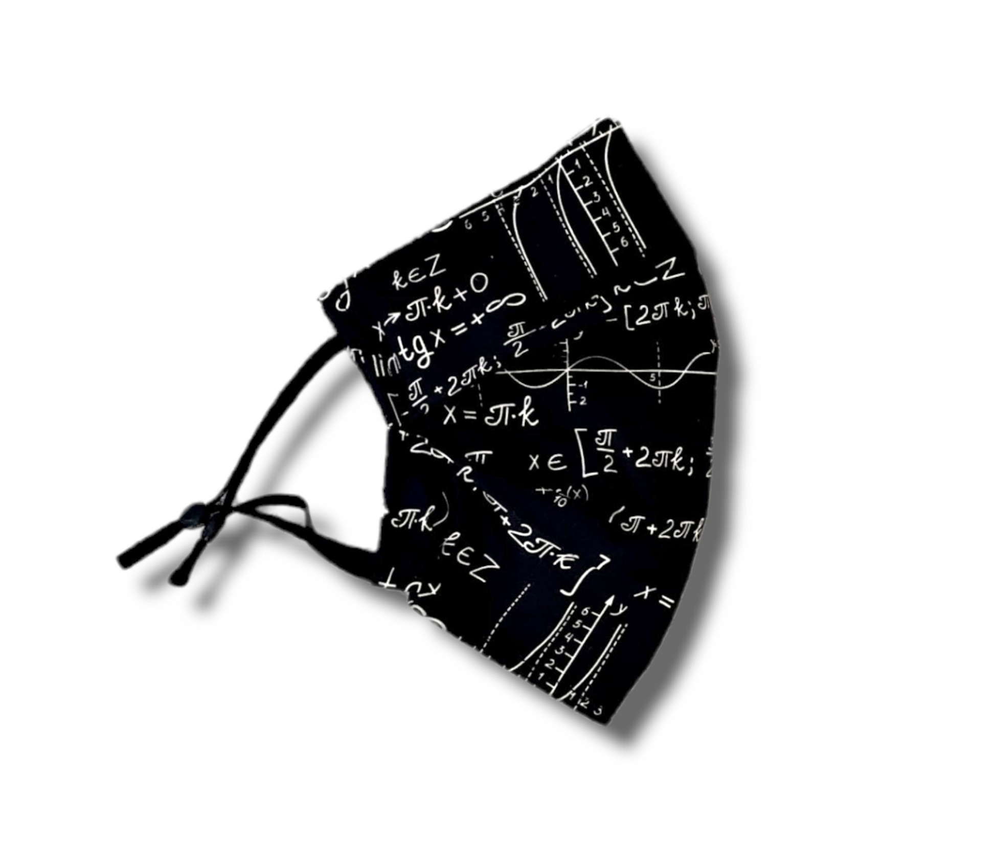 Black mathematics teacher, student facemask. Washable and reusable with filter pocket. Adjustable elastic ear loops with toggle adjustment.