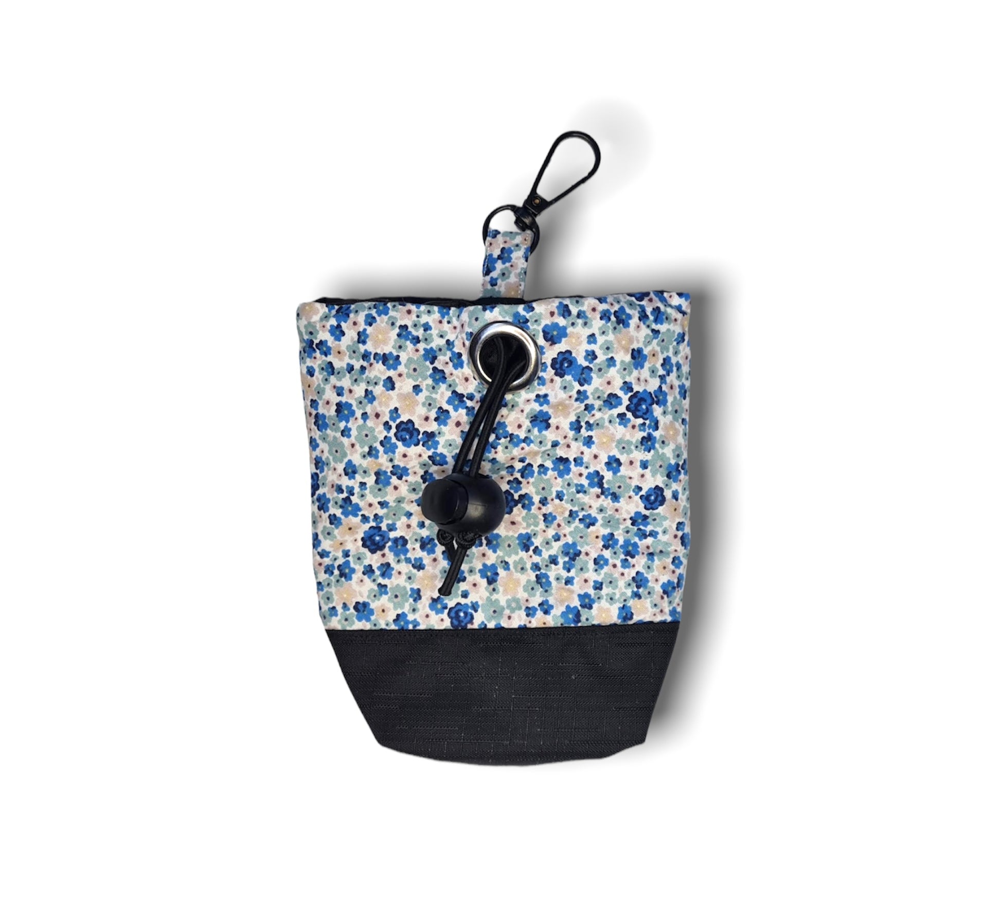 In a gorgeous paw print fabric - its every dog owners must have! This nifty little bag attaches onto your dog lead, belt or jacket with a swivel hook that is located at the top of the bag. It comes with two compartments the first one being a waterproof lining for your dogs treats however once you pull out this lining and separate the Velcro it brings you too the second compartment to slot your poo bags in, perfect for one roll of bags! Then all that is left to do is Velcro the lining back together and push it back in the bag, close it shut with the drawstring and toggle and your ready for your walk! A great added feature of this bag is the waterproof base and lining so if you where to put it down anywhere whist on your walk your contents will stay dry and safe! This bag is perfect for treats on the go or ideal for training your pup! It is easy to keep clean by pulling the lining out and giving it a quick wipe over and your all crumb free again.