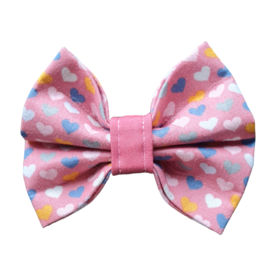 Get your dog ready for the day of love with our valentines love heart bow ties and sailor bows. This bow comes in a lovely dusky pink with small bows scattered over it. its a lovely touch to and dogs collar for the special day. Simple to put on your dogs collar simply attach by sliding the collar through the 2 elastic straps attached to the back of the bow.