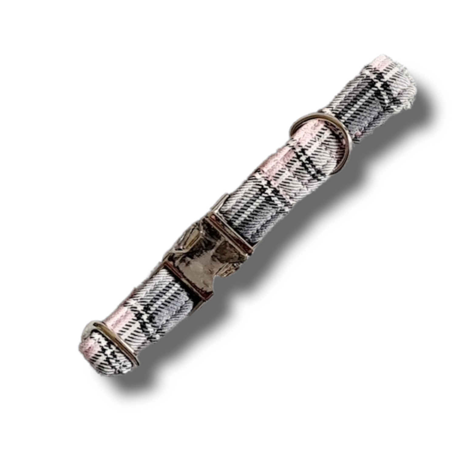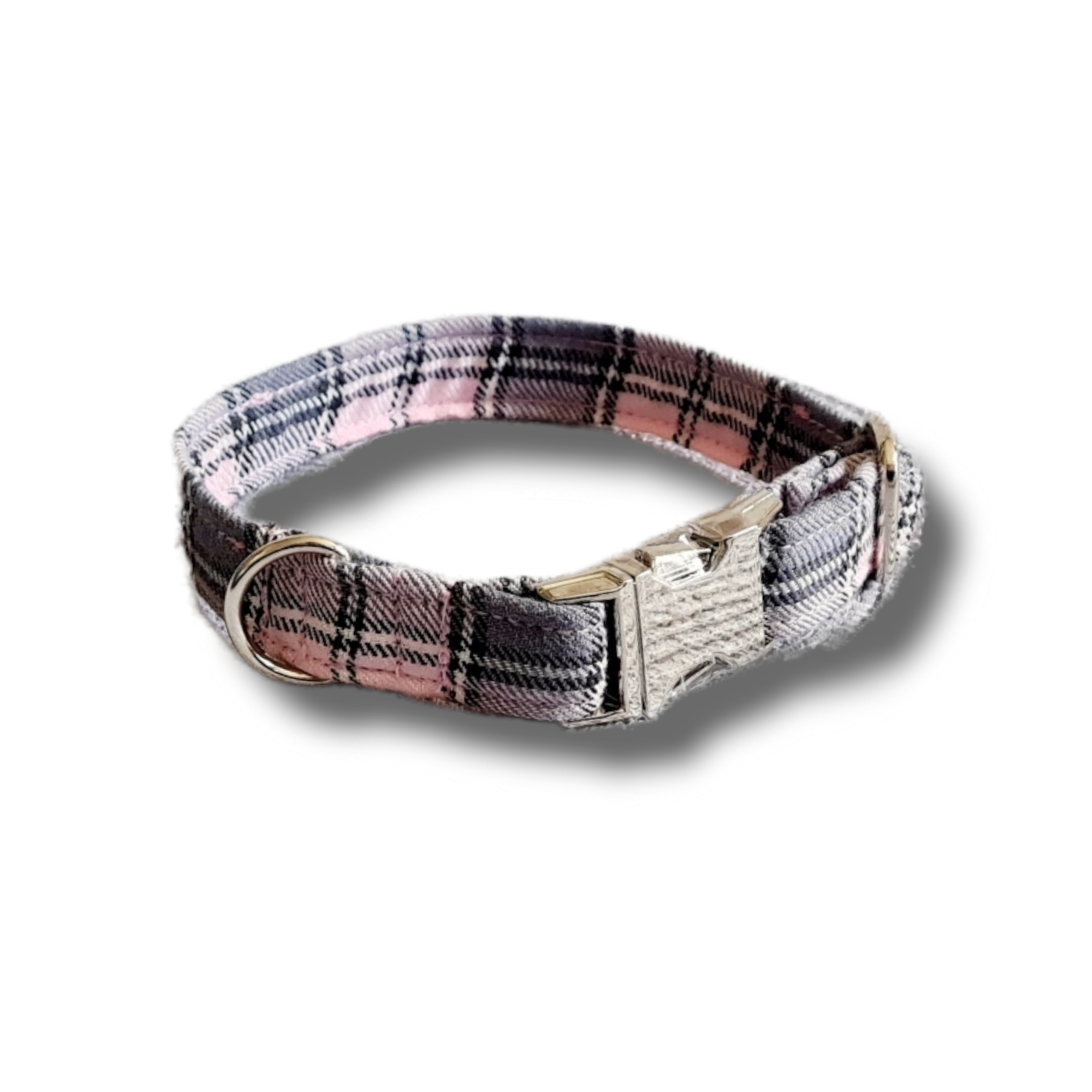 Pink and grey plaid dog collar.
