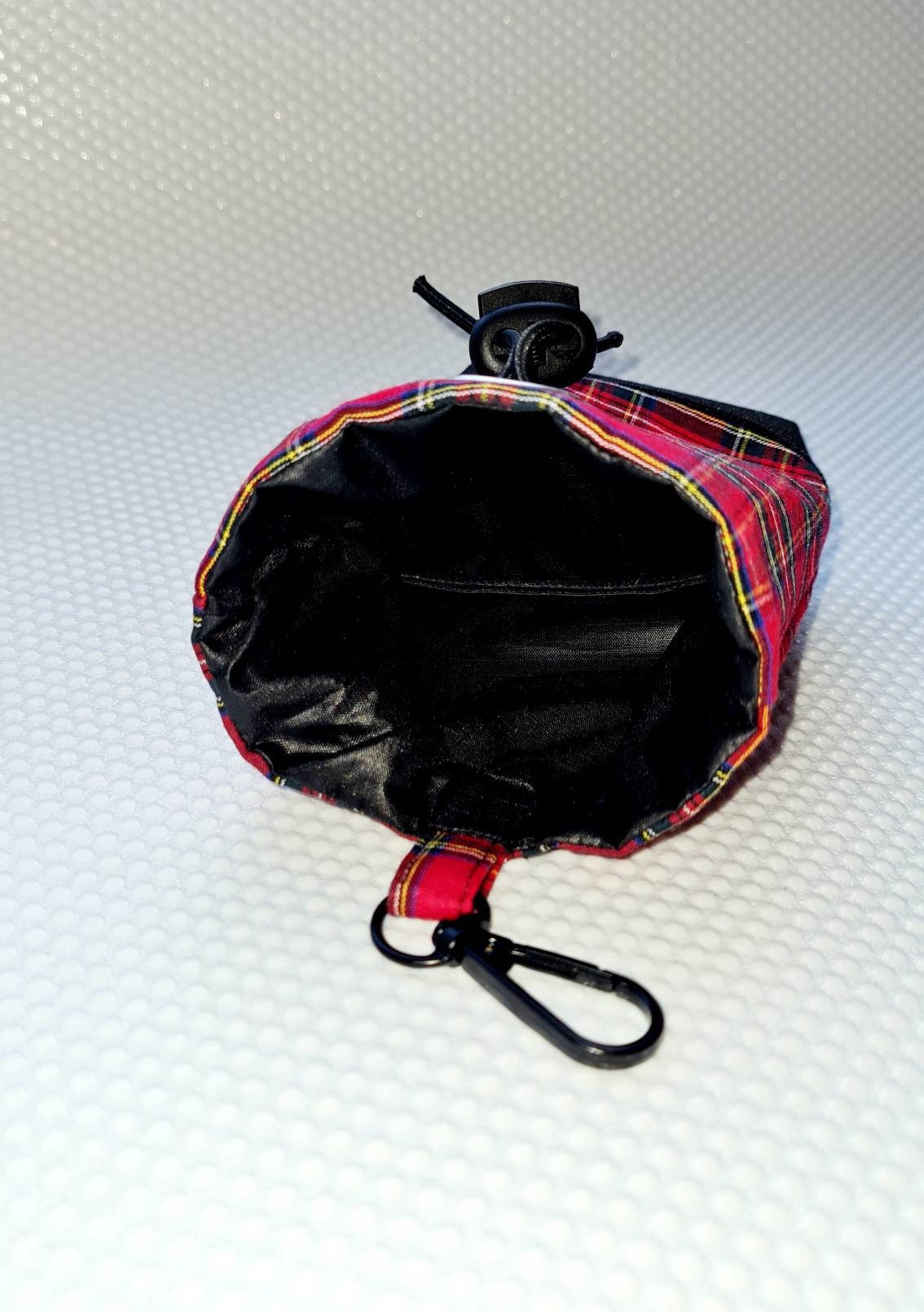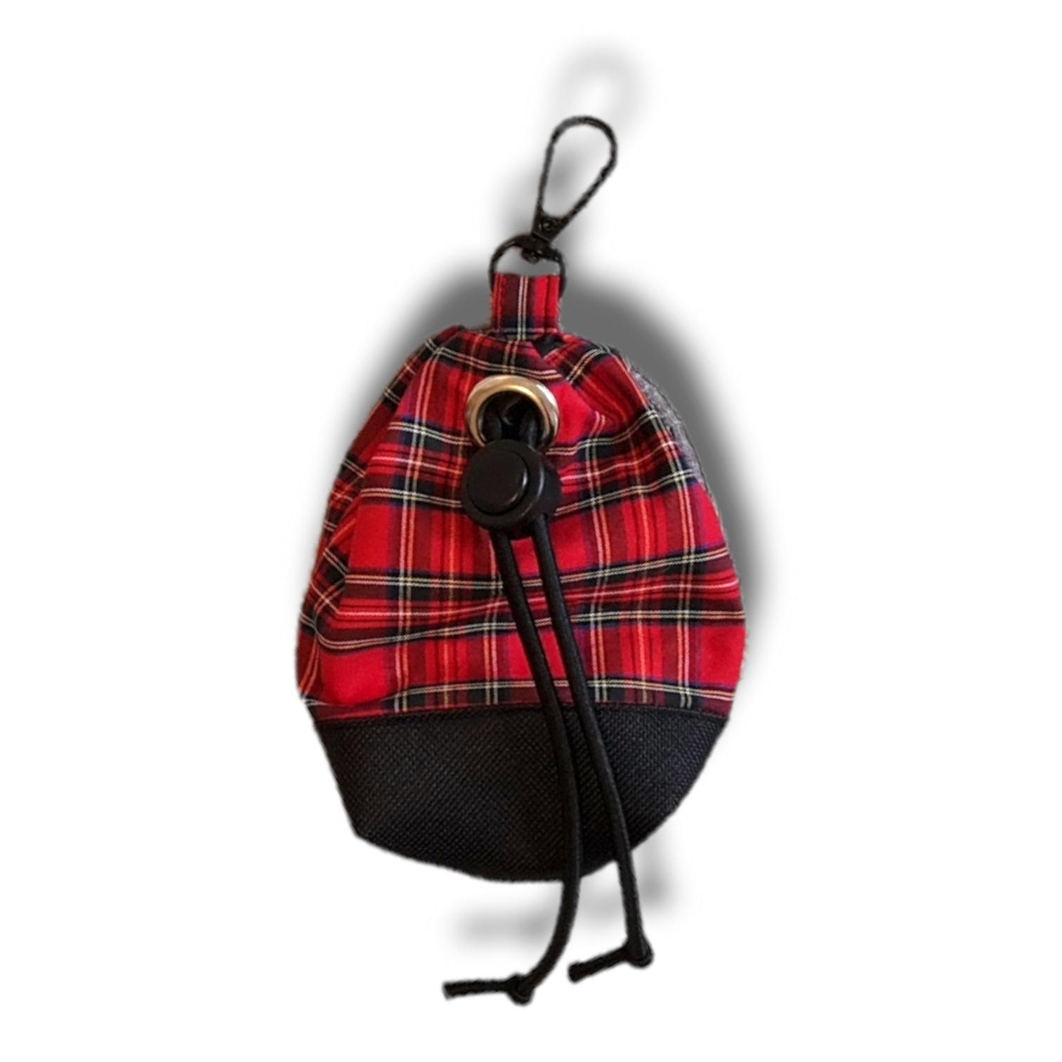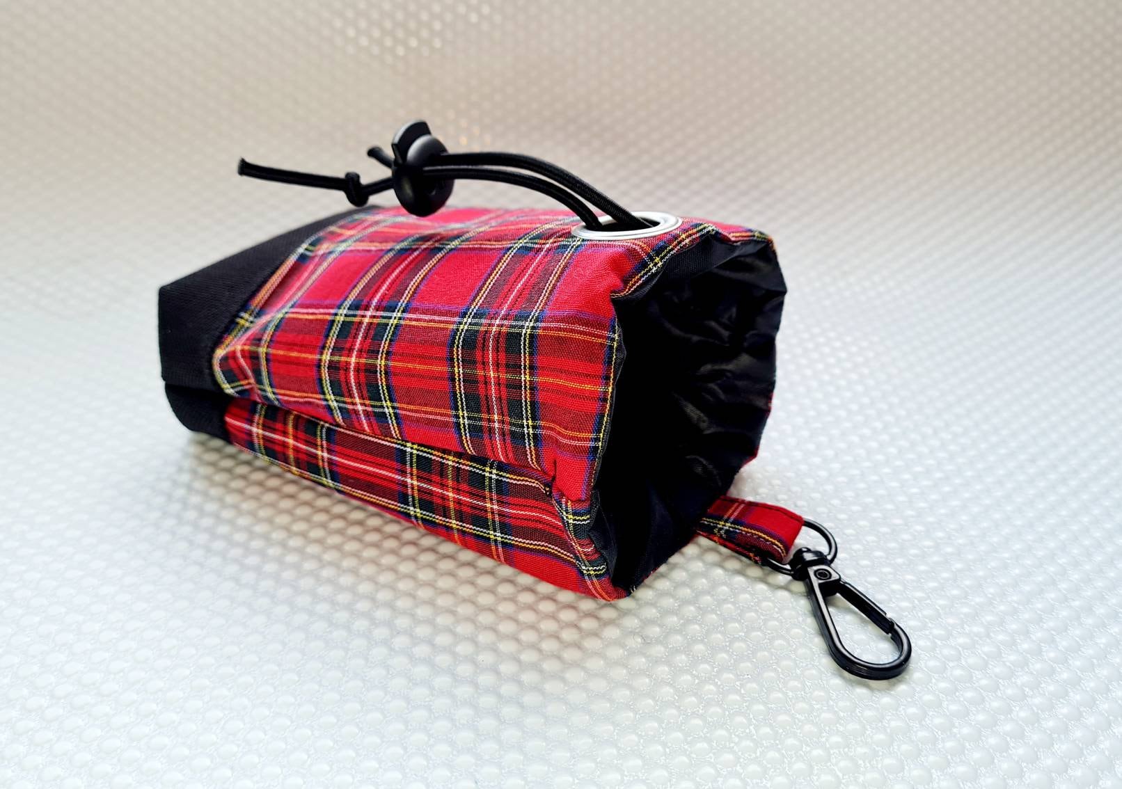Red tartan dog treat bag with poo bag holder compartment and drawstring opening/closing