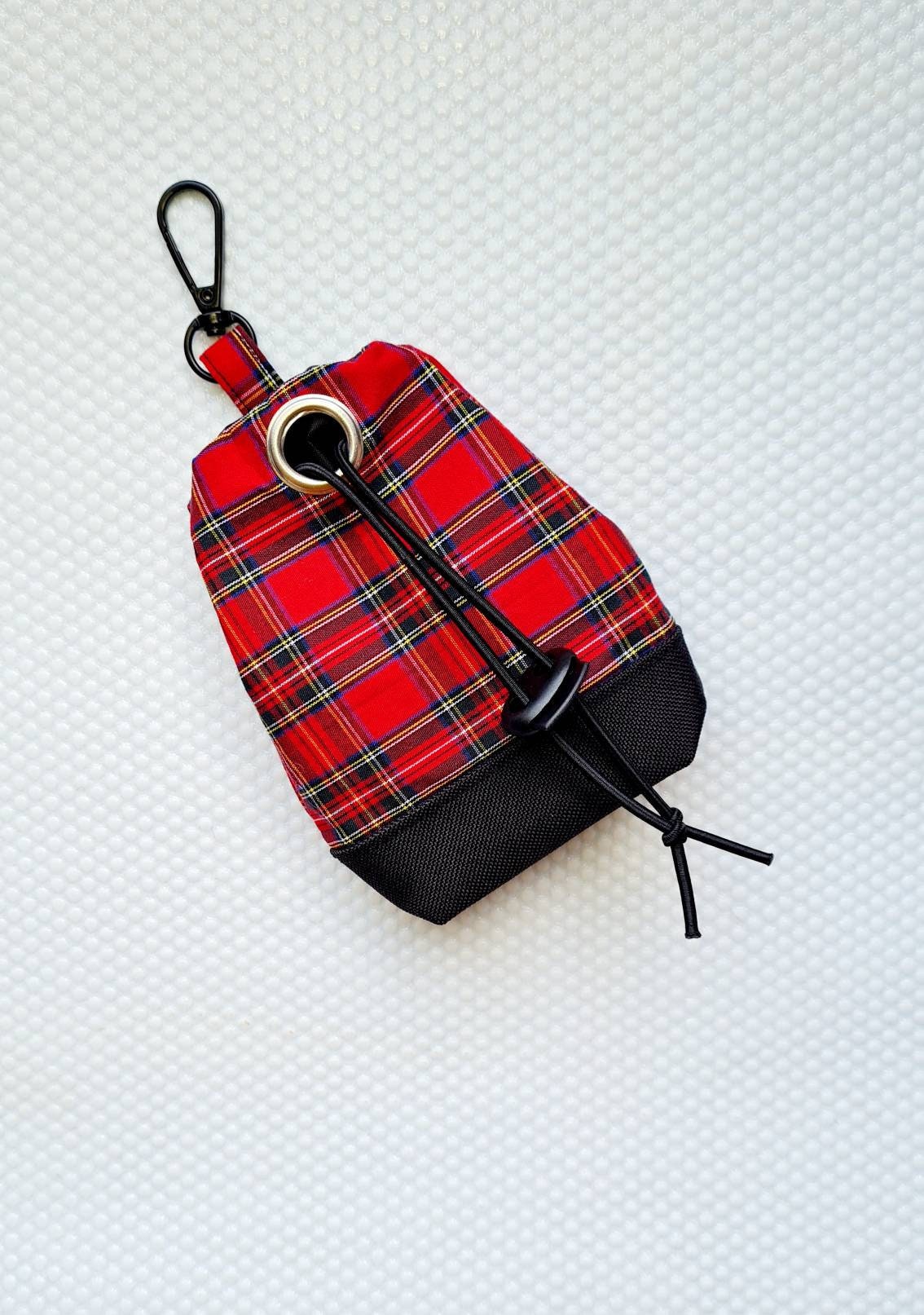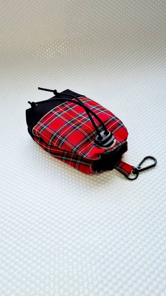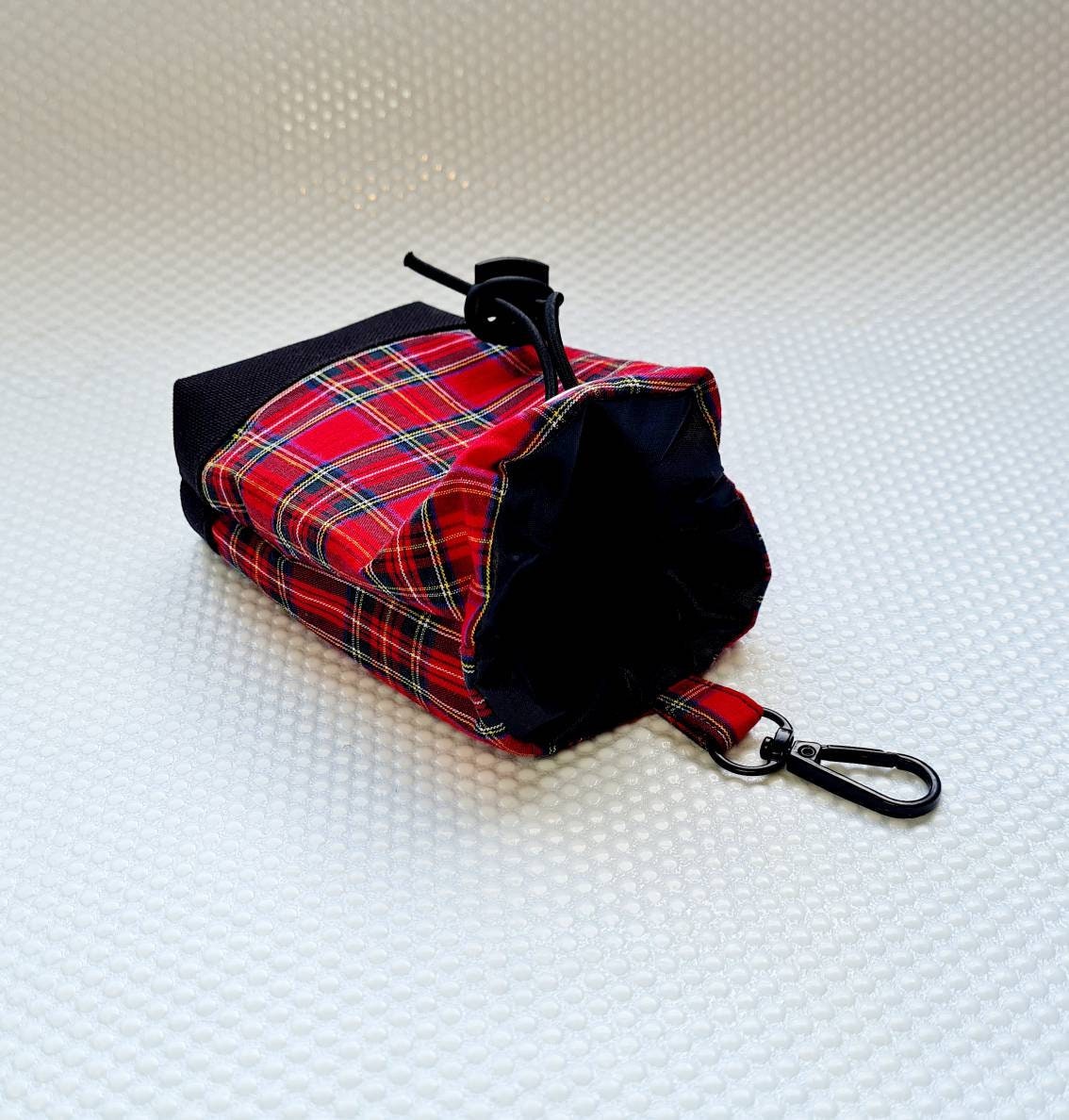 Red tartan dog treat bag with poo bag holder compartment and drawstring opening/closing